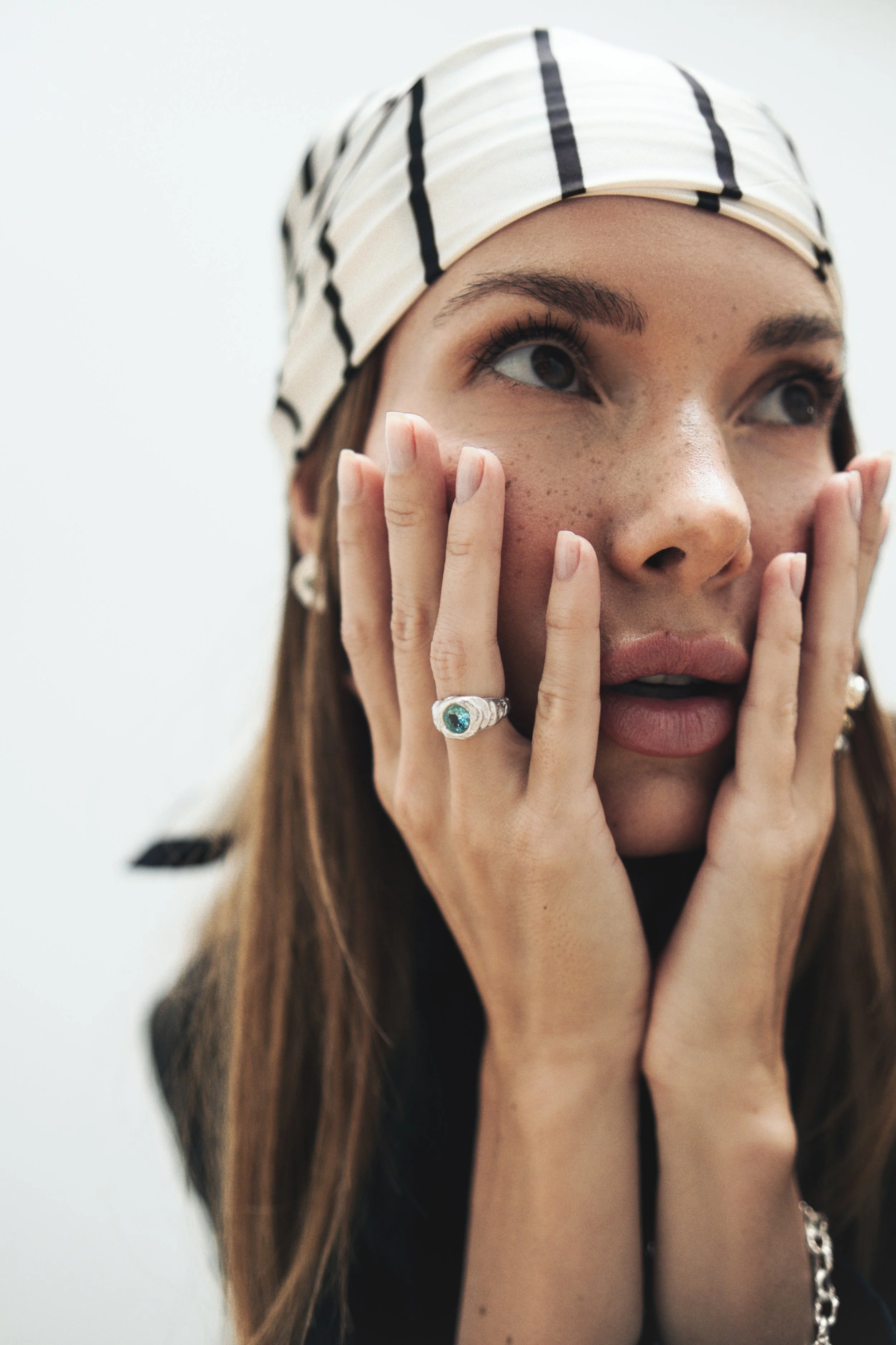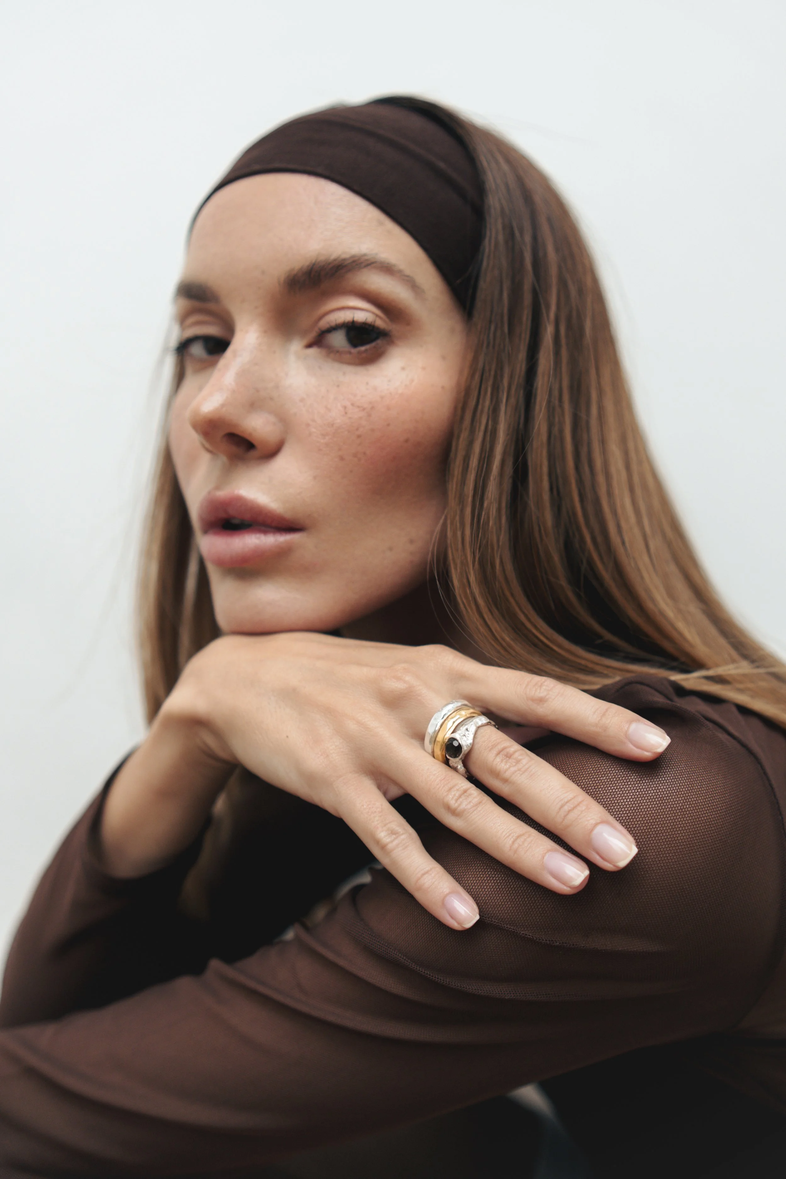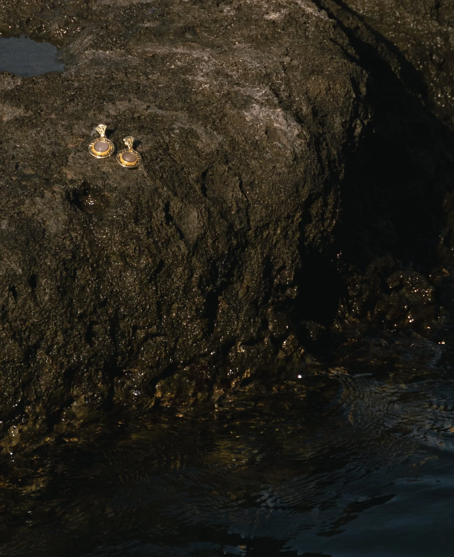 People swimming and wading in the ocean near a dark sandy shore on a sunny day.